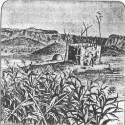 As the corn ripens, you may see fires burning at almost any of the quaint little farm huts (see fig. 6), for children or very old men watch there day and night, to keep crows, coyotes, and burros away. The crows are worse than they were last spring. The coyotes are not outdone by the crows at either time, but the burros are worse than both together. They are, to quote Zuñi, Mi'-wi-hâ or "adopted of corn." You may put them in the corrals, tie their fore-feet close together, or herd them as you will, but some of them will "leave tracks and love corn in every field." The remedies are many and ingenious, but all more or less fatally short of happy results. Each man in Zuñi knows every other man, and equally as well, he knows every other man's burros. If a burro is found in a cornfield some morning, the field owner counts the exact number of missing or injured ears, and drives the burro home. Forthwith he seeks out the animal's owner. If the latter prove obdurate, the sufferer informs the chief and bides his time. Woe to that burro if he get into the cornfield again. He may consider himself fortunate if he lose but one or even both ears. Sometimes he is gagged with a big stick, a cord being passed from either end of the stick up over the shoulders and back, and under the tail. The burro is then welcome to remain in the cornfield as long as he chooses. At other times, the luckless animal is thrown and a few of his teeth pulled Zuñi fashion; which is to say, a thread of sinew is looped to each, a heavy stone is tied to the sinew, and hurled into the air. I remember a lawsuit of three nights' duration over one of these animals. Ever after, he was called the "short-horn," and little wonder! For his ears had been shaved close to his head, his tail cut off short, the tip of his tongue and part of his teeth amputated, his left eye put out, and his back so stiffened by castigation that a five-foot straight-edge laid lengthwise along the very acute angle of his vertebra, would have touched at every point. Two years I knew that burro personally. His working days were over. He used to get deplorably hungry, and I sometimes fed him; for, winter or summer, he dared not stir from the protecting although inhospitable shadows of the walls of Zuñi. He preferred picking cedar bark from the fire-wood, anything he preferred, to going abroad. In fact, had he been able to run he would certainly have done so at the sight of a field of corn.