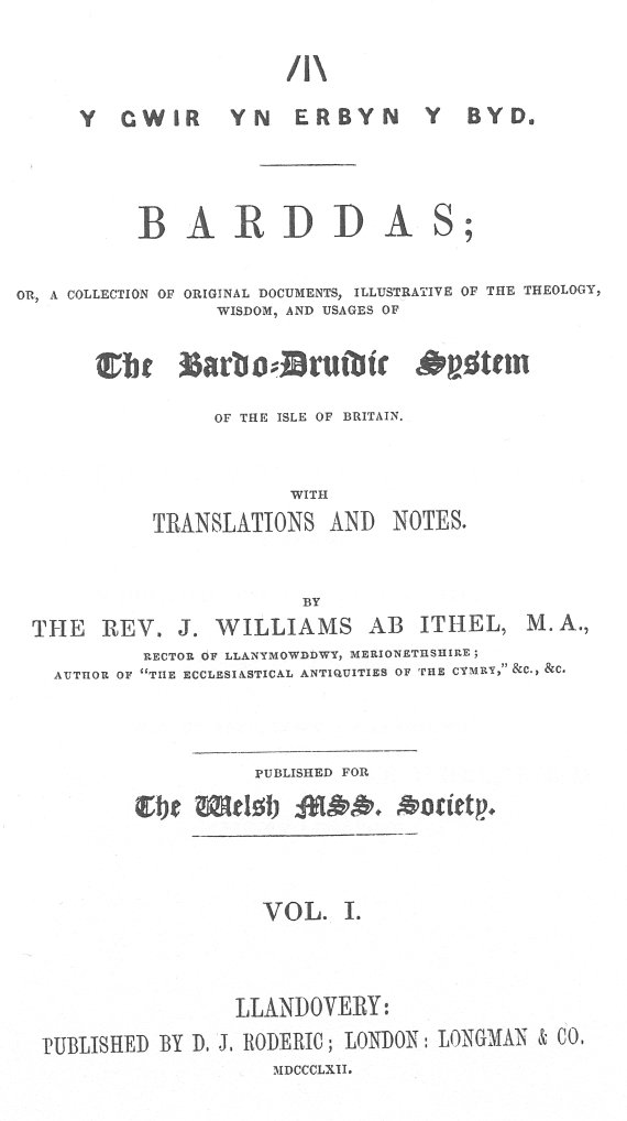 The Barddas of Iolo Morganwg, Vol. I., ed. by J. Williams Ab Ithel, [1862], at sacred-texts.com