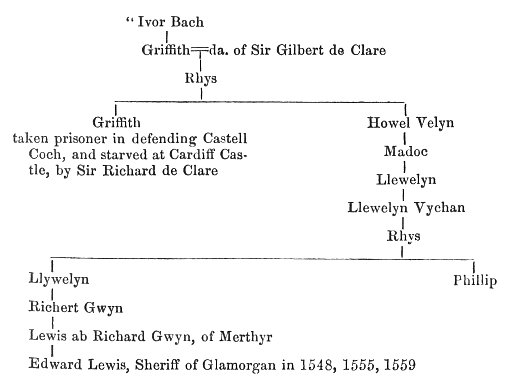 [paragraph continues] Thomas Lewis married Margaret, daughter of Robert Gamage of Coyty, and uncle of the Countess of Leicester, the great Gamage heiress; and as his eldest p. 167 son was born in 1560, the marriage probably took place during the Shrievalty of Sir Edward Lewis in 1559.