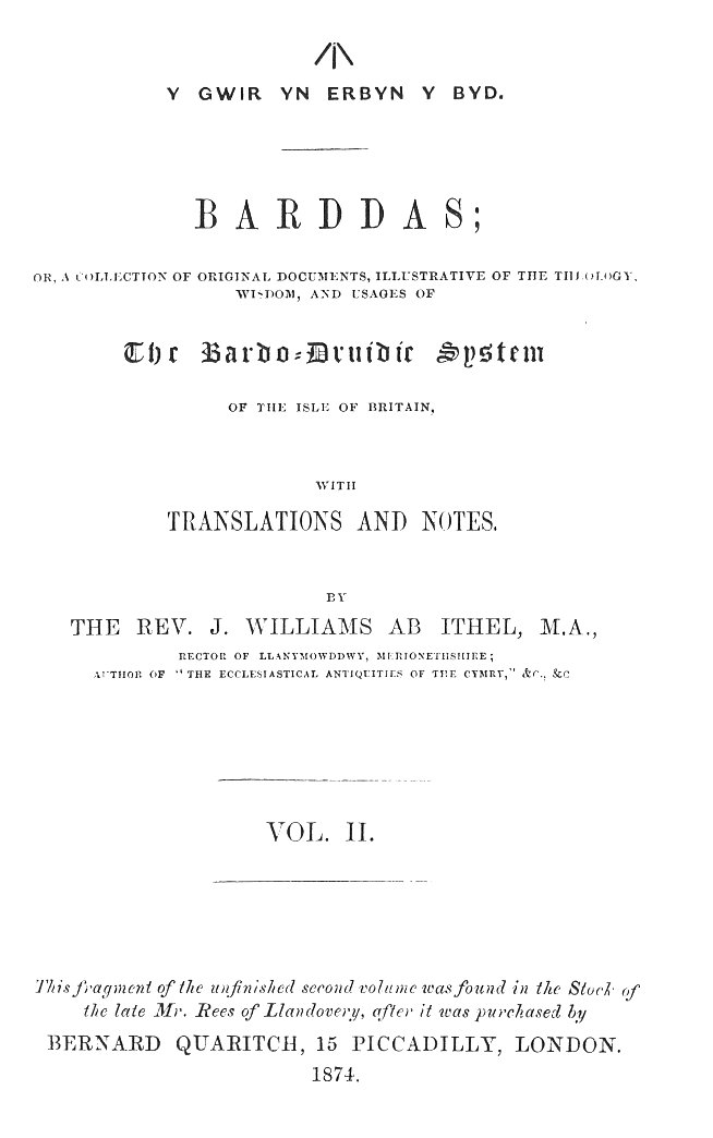 This fragment of the unfinished second volume was found in the Stock of the late Mr. Rees of Llandovery, after it was purchased by