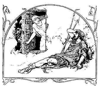 The woman that had charge of her, gave Deirdre every information and skill of which she herself had knowledge and skill. There was not a blade of grass growing from root, nor a bird singing in the wood, nor a star shining from heaven but Deirdre had a name for it. But one thing, she did not wish her to have either part or parley with any single living man of the rest of the world. But on a gloomy winter night, with black, scowling clouds, a hunter of game was wearily travelling the hills, and what happened but that he missed the trail of the hunt, and lost his course and companions. A drowsiness came upon the man as he wearily wandered over the hills, and he lay down by the side of the beautiful green knoll in which Deirdre lived, and he slept. The man was faint from hunger and wandering, and benumbed with cold, and a deep sleep fell upon him. When he lay down beside the green hill where Deirdre was, a troubled dream came to the man, and he thought that he enjoyed the warmth of a fairy broch, the fairies being inside playing music. The hunter shouted out in his dream, if there