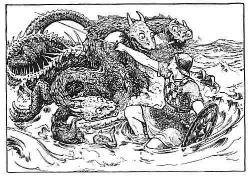 "He is a champion who stands the war," said the youth. And to meet the beast he went with his sword and his dog. But there was a spluttering and a splashing between himself and the beast! The dog kept doing all he might, and the king's daughter was palsied by fear of the noise of the beast! One of them would now be under, and now above. But at last he cut one of the heads off it. It gave one roar, and the son of earth, echo of the rocks, called to its screech, and it drove the loch in spindrift from end to end, and in a twinkling it went out of sight.