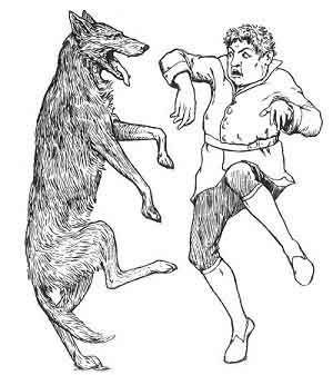 So there was no more fighting that day, and Tom was invited to dine with the royal family. Next day, Redhead told Tom of a wolf, the size of a yearling heifer, that used to be serenading about the walls, and eating people and cattle; and said what a pleasure it would give the king to have it killed.