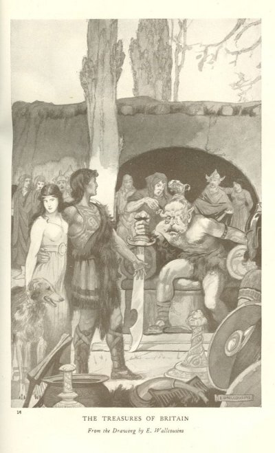 The "Thirteen Treasures of Britain" were famous in early legend. They belonged to gods and heroes, and were current in our island till the end of the divine age, when Merlin, fading out of the world, took them with him into his airy tomb, never to be seen by mortal eyes again. According to tradition, 2 they consisted of a sword, a basket, a drinking-horn, a chariot, a halter, a knife, a cauldron, a whetstone, a garment, a pan, a platter, a chess-board, and a mantle, all possessed of not less marvellous qualities than the apples, the pig-skin, the spear, the horses and chariot, the pigs, the hound-whelp, and the cooking-spit which the sons of Tuirenn obtained for Lugh. 3 It is these same legendary treasures that reappear, no doubt, in the story of "Kulhwch and Olwen". The number tallies, for there are thirteen of them. Some are certainly, and others