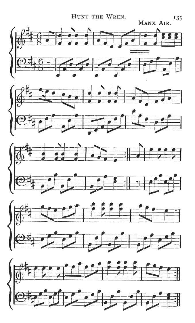 [paragraph continues] In Man at the present day the bush decorated with ribbons and flowers still survives, and the wren is occasionally found ensconced within it, but the song has dwindled to a mere fragment.