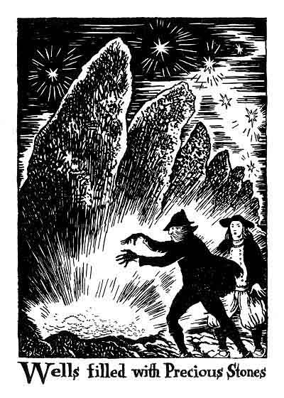 The beggar leapt through the heather, followed by Bernez, to the place where the rocks had been. There, where they stood, two wells were glittering, filled up to their brims with gold, silver and precious stones.