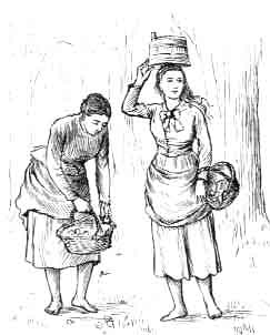 Mrs. Macgillicuddy's house is at the corner of the two principal streets of Killarney town, and the drawing-room windows command each a street. Before one window is a dismal, rickety building, with a slate face, that looks like an ex-town hall. There is a row of arches to the ground floor, the angles at the base of which seem to have mouldered or to have been kicked away. Over the centre arch is a picture with a flourishing yellow inscription above, importing that it is the meeting-place of the Total Abstinence Society. Total abstinence is represented by the figure of a gentleman in a blue coat and drab tights, with gilt garters, who is giving his hand to a lady; between them is an escutcheon surmounted with a cross and charged with religious emblems. Cupids float above the heads and between the legs of this happy pair, while an exceedingly small tea-table with the requisite crockery reposes against the lady's knee; a still, with death's-head, and bloody-bones, filling up the naked corner near the gentleman. A sort of market is held here, and the place is swarming with blue cloaks and groups of men talking; here and there is a stall with coarse linens, crockery, and cheese; and crowds of egg and milk-women are squatted on the pavement, with their ragged customers or gossips; and the yellow-haired girl on the next page, with a barrel containing nothing at all, has been sitting, as if for her portrait, this hour past.