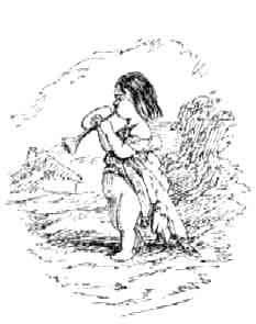 "I was one day on my travels," says the Black Thief, "and I came into a large forest, where I wandered a long time and could not get out of it. At length I came to a large castle, and fatigue obliged me to crawl into the same, where I found a young woman, and a child sitting on her knee and she crying. I asked her what made her cry, and where the lord of the castle was, for I wondered greatly that I saw no stir of servants or any person about the place. 'It is well for you,' says the woman, 'that the lord of this castle is not at home at present; for he is a monstrous giant, with but one eye on his forehead, who lives on human flesh. He brought me this child,' says she,--'I do not know where he got it--and ordered me to make it into a pie, and I cannot help crying at the command.' I told her that if she knew of any place convenient that I could leave the child safely, I would do it, rather than it should be buried in the bowels of such a monster. She told of a house a distance off, where I would get a woman who would take care of it. 'But what will I do in regard of the pie?' 'Cut a finger off it,' said I, 'and I will bring you in a young wild pig out of the forest, which you may dress as if it was the child, and put the finger in a certain place, that if the giant doubts anything about it, you may know where to turn it over at first, and when he sees it he will be fully satisfied that it is made of the child.' She agreed to the plan I proposed; and, cutting off the child's finger, by her direction I soon had it at the house she told me of and brought her the little pig in the place of it. She then made ready tbe pie; and, after eating and drinking heartily myself, I was just taking my leave of the young woman when we observed the giant coming through the castle-gates. 'Lord bless me ' said she, 'what will you do now? run away and lie down among the dead bodies that he has in the room' (showing me the place), 'and strip off your clothes that he may not know you from the rest if be has occasion to go that way.' I took her advice, and laid myself down among the rest, as if dead, to see how he would behave. The first thing I heard was him calling for his pie. When she set it down before him, he swore it smelt like swine's flesh; but, knowing where to find the finger, she immediately turned it up--which fairly convinced him of the contrary. The pie only served to sharpen his appetite, and I heard him sharpen his knife, and saying he must have a collop or two, for he was not near satisfied. But what was my terror when I heard the giant groping among the bodies, and, fancying myself, cut the half of my hip off, and took it with him to be roasted. You may be certain I was in great pain; but the fear of being killed prevented me from making any complaint. However, when he had eat all, he began to drink hot liquors in great abundance, so that in a short time he could not hold up his head, but threw himself on a large creel he had made for the purpose, and fell fast asleep. When ever I heard him snoring, bad as I was, I went up and caused the woman to bind my wound with a handkerchief; and taking the giant's spit, I reddened it in the fire, and ran it through the eye, but was not able to kill him. However, I left the spit sticking in his head and took to my heels; but I soon found he was in pursuit of me, although blind; and, having an enchanted ring, he threw it at me, and it fell on my big toe and remained fastened to it. The giant then called to the ring, 'Where it was?' and to my great surprise it made him answer, 'On my foot,' and he, guided by the same, made a leap at me--which I had the good luck to observe, and fortunately escaped the danger. However, I found running was of no use in saving me as long as I had the ring on my foot; so I took my sword and cut off the toe it was fastened on, and threw both into a large fish-pond that was convenient. The giant called again to the ring, which, by the power of enchantment, always made answer; but he, not knowing what I had done, imagined it was still on some part of me, and made a violent leap to seize me--when he went into the pond over head and ears and was drowned. Now, Sir Knight," said the Thief of Sloan, "you see what dangers I came through and always escaped; but indeed I am lame for want of my toe ever since."