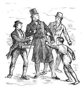 The traveller no sooner issues from the inn by a back door, which he is informed will lead him straight to the Causeway than the guides pounces upon him, with a dozen rough boatmen who are likewise lying in wait; and a crew of shrill beggar-boys with boxes of spars, ready to tear him and each other to pieces seemingly, and bawl incessantly round him. "I'm the guide Miss Henry recommends," shouts one. "I'm Mr Macdonald's guide," pushes in another. "This way" roars a third, and drags his prey down a precipice; the rest of them clambering and quarrelling after. I had no friends, I was perfectly helpless. I wanted to walk down to the shore by myself, but they would not let me, and I had nothing for it but to yield myself into the hands of the guide who had seized me, who hurried me down the steep to a little wild bay flanked on each side by rugged cliffs and rocks, against which the waters came tumbling, frothing, and roaring furiously. Upon some of these black rocks two or three boats were lying: four men seized a boat, pushed it shouting into the water, and ravished me into it. We had slid between two rocks, where the channel came gurgling in: we were up one swelling wave that came in a huge advancing body 10 feet above us and were plunging madly down another, (the descent causes a sensation in the lower regions of the stomach which it is not necessary here to describe,) before I had leisure to ask myself why the deuce I was in that boat, with four rowers hurrooing and bounding madly from one huge liquid mountain to another--four rowers whom I was bound to pay. I say, the query came qualmishly across me why the devil I was there, and why not walking calmly on the shore.
