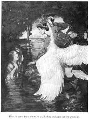 Two of the maidens soon came out of the water, put on their swanskins and flew away as swans. The younger maiden stayed for a while in the lake. Then she came out and began to search for her swanskin. She searched and searched, and at last the King's Son heard her say, "I would do anything in the world for the creature who would find my swanskin for me." Then he came from where he was hiding and gave her the swanskin. "I am the Son of the King of Ireland," he said, "and I want you to show me the way to your father's dominion."