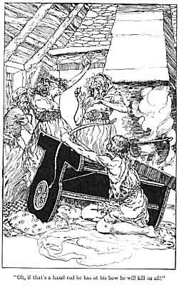 Gilly of the Goatskin crept from under the cradle, put his bow resting on the bottom that was now turned uppermost, took up some of the rods that were on the floor and then shouted at the Hags. "Oh, if that's a hazel rod he has at his bow he will kill us all," they screamed out together.