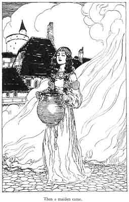 Then the time came to take fire to the houses. They who came for fire were all young maidens. Each came into the light of one of the great fires, took coals from a fire that had burnt low, placed them in a new earthen vessel and went away. Flann thought that all the maidens were beautiful and wonderful, although the King's Son told him that some were black-faced, and some crop- headed and some hunchbacked. Then a maiden came, who was so high above the rest that Flann had no words to speak of her.