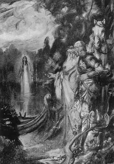 "And so Merlin and Arthur departed, and as they rode along King Arthur said, 'I have no sword.' 'No force,' 1 said Merlin; 'here is a sword that shall be yours, an I may.' So they rode till they came to a lake, which was a fair water and a broad; and in the midst of the lake King Arthur was aware of an arm clothed in white samite, that held a fair sword in the hand. 'Lo,' said Merlin unto the King, 'yonder is the sword that I spoke of.' With that they saw a damsel going upon the lake. 'What damsel is that?' said the King. 'That is the Lady of the Lake,' said Merlin; 'and within that lake is a rock, and therein is as fair a place as any on earth, and richly beseen; and this damsel will come to you anon, and then speak fair to her that she will give you that sword.' Therewith came the damsel to King Arthur and saluted him, and he her again. 'Damsel,' said the King, 'what sword is that which the arm holdeth yonder above the water? I would it were