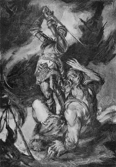 Iron indeed would have been the grasp which could have held a knight so doughty as Arthur. Slipping from the monster's clutches, the King hacked at his adversary now in one place, now in another, till at length he smote the giant so mightily that Excalibur was buried deep in his brain-pan. The giant fell like an oak torn up by the roots in the fury of the winds. Rushing up as he crashed to the earth, Sir Bedivere struck off the hideous head, grinning in death, to be a show to those in the tents below.