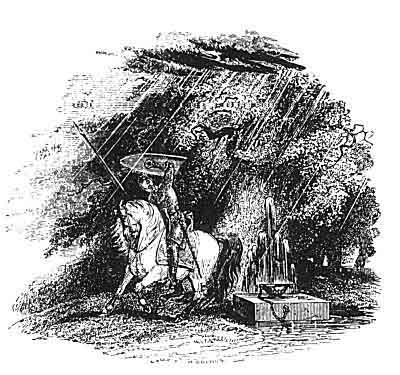 Then Kai threw a bowlful of water upon the slab, and immediately there came the thunder, and after the thunder the shower. And such a thunderstorm they had never known before, and many of the attendants who were in Arthur's train were killed by the shower. After the shower had ceased the sky became clear; and on looking at the tree they beheld it completely leafless. Then the birds descended upon the tree, and the song of the birds was far sweeter than any strain they had ever heard before. Then they beheld a knight on a coal-black horse, clothed in black satin, coming rapidly towards them. And Kai met him and encountered him, and it was not long before Kai was overthrown. And the knight withdrew, and Arthur and his host encamped for the night.