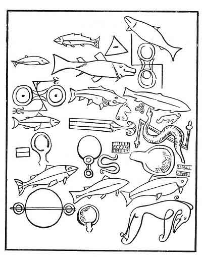 The mythology has to do with fish; so has that of the two stories which follow; so, as an illustration, I have copied all the fish which are figured in the "Sculptured Stones of Scotland," together with some of the characteristic ornaments which accompany them.