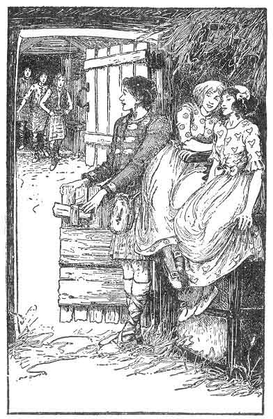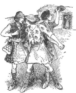 The very--next morning, when Duncan and his brothers went to the byre behind the bothy where they had lodged their companions for the night, what was their surprise to see a handsome young man, clad in tartan, standing by the door, and two fair maidens seated by him on the cheese-press.