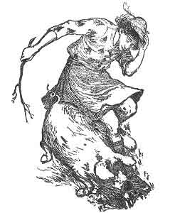 And, sure enough, there she was, coursing over the moor in a direct line with them, waving her magic staff. As she strode over the pools, the water splashed upwards in brown foam before her; as she clambered over the peat-hags, the divots and turves flew away on every side; as she swept along the dry path, the dust in clouds whirled behind her like an attendant spirit.