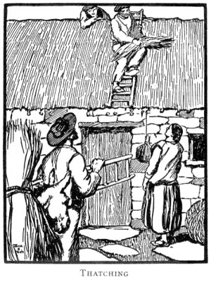 In our own cottage the thatching--it is done every year--has just been carried out. The rope-twisting was done partly in the lane, partly in the kitchen when the weather was uncertain. Two men usually sit together at this work, one of them hammering the straw with a heavy block of wood, the other forming the rope, the main body of which is twisted by a boy or girl with a bent stick specially formed for this employment.