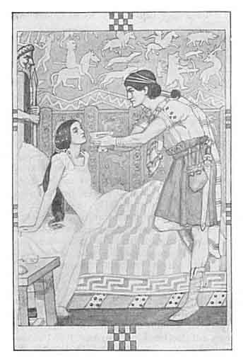Jeermit entered the castle. He saw many courtiers with pale faces. None spoke: all were hushed to silence with grief. The queen came towards him, and she seized his right hand and led him towards the chamber in which the dying princess lay.