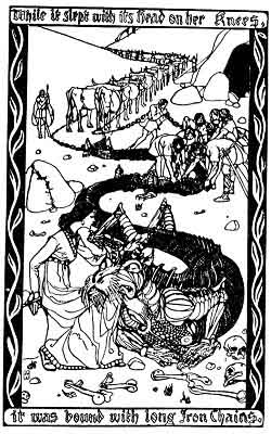 Some time after they came to the Honey Island, the Cymry were much troubled by a monster called an afanc, which broke the banks of Llyn Llion, in which it dwelt, and flooded their lands. No spear, dart, or arrow made any impression upon its hide, so Hu Gadarn resolved to drag it from its abode and to place it where it could do no harm. A girl enticed it from its watery haunt, and while it slept with its head on her knees it was bound with long iron chains. When it woke and perceived what had been done, it got up, and, tearing off its sweetheart's breast in revenge, hurried to its old refuge. But the chains were fastened to Hu Gadarn's team of bannog oxen, which pulled it out of the lake and dragged it through the mountains to Llyn y Ffynnon Las, the Lake of the Green Well, in Cwm Dyli, in Snowdonia. A pass through which they laboured has ever since been called Bwlch Rhiw'r Ychen, the Pass of the Slope of the Oxen. One of the oxen dropped one of its eyes through its exertions in this defile, and the place is styled Gwaun Llygad Ych, the Moor of the Ox's Eye. A pool was formed where the eye fell, which is known as Pwll Llygad Ych, the Pool of the Ox's Eye; this pool is never dry, though no water rises in it or flows into it except when rain falls, and no water flows out of it, but it is always of the same depth, reaching just to the knee-joint.