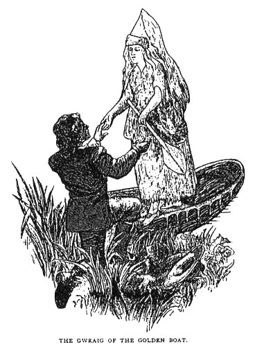 In a more polished and elaborate form this legend omits the medical features altogether, but substitutes a number of details so peculiarly Welsh that I cannot refrain from presenting them. This version relates that the enamoured farmer had heard of the lake maiden, who rowed up and down the lake in a golden boat, with a golden oar. Her hair was long and yellow, and her face was pale and melancholy. In his desire to see this wondrous beauty, the farmer went on New Year's Eve to the edge of the lake, and in silence awaited the coming of the first hour of the new year. It came, and there in truth was the maiden in her golden boat, rowing softly to and fro. Fascinated, he stood for hours beholding her, until the stars faded out of the sky, the moon sank behind the rocks, and the cold gray dawn drew nigh; and then the lovely gwraig began to vanish from his sight. Wild with passion, and with the thought of losing her for ever, he cried aloud to the retreating vision, 'Stay! stay Be my wife.' But the gwraig only uttered a faint cry, and was gone. Night after night the young farmer haunted the shores of the lake, but the gwraig returned no more. He became negligent of his person; his once robust form grew thin and wan; his face was a map of melancholy and despair. He went one day to consult a soothsayer who dwelt on the mountain, and this grave personage advised him to besiege the damsel's heart with gifts of bread and cheese. This counsel commending itself strongly to his Welsh way of thinking, the farmer set out upon an assiduous course of casting his bread upon the waters, accompanied by cheese. He began on Midsummer eve by going to the lake and dropping therein a large cheese and a loaf of bread. Night after night he continued to throw in loaves and cheeses, but nothing appeared in answer to his sacrifices. His hopes were set, however, on the approaching New Year's eve. The momentous night arrived at last. Clad in his best array, and armed with seven white loaves and his biggest and handsomest cheese, he set out once more for the lake.