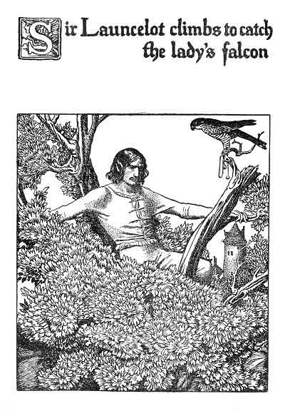 | Sir Launcelot beholdeth a falcon entangled. |