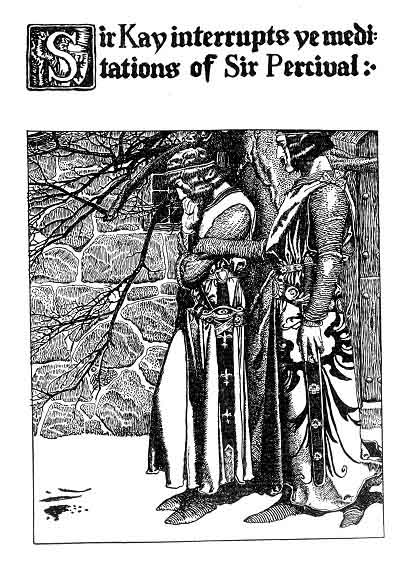 But Sir Gawaine perceived that Sir Percival was altogether sunk in deep thought, wherefore he said: "Nay, thou wilt do ill to disturb that knight; for either he hath some weighty matter upon his mind, or else he is bethinking him of his lady, and in either case it would be a pity to disturb him until he arouses himself."