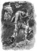The news of Jack's victory soon spread over all the West of England, so that another giant, named Blunderbore, hearing of it, vowed to be revenged on the little hero, if ever it was his fortune to light on him. This giant was the lord of an enchanted castle situated in the midst of a lonesome wood. Now Jack, about four months afterwards, walking near this wood in his journey to Wales, being weary, seated himself near a pleasant fountain and fell fast asleep. While he was enjoying his repose, the giant, coming for water, there discovered him, and knew him to be the far-famed Jack, by the lines written on the belt. Without ado, he took Jack on his shoulders and carried him towards his enchanted castle. Now, as they passed through a thicket, the rustling of the boughs awakened Jack, who was strangely surprised to find himself in the clutches of the giant. His terror was not yet begun, for on entering the castle, he saw the ground strewed with human bones, the giant telling him his own would ere long increase them. After this the giant locked poor Jack in an immense chamber, leaving him there while he went to fetch another giant living in the same wood to share in Jack's destruction. While he was gone, dreadful shrieks and lamentations affrighted Jack, especially a voice which continually cried--