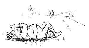 There was no time to waste words; so the farmer mounted his horse and rode off after Jack Hannaford. The old soldier heard the horse's hoofs clattering on the road behind him, so he knew it must be the farmer pursuing him. He lay down on the ground, shading his eyes with one hand, looked up into the sky, and pointed heavenwards with the other hand.
