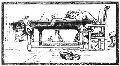Well, the ogre had his breakfast, and after that he goes to a big chest and takes out a couple of bags of gold, and down he sits and counts till at last his head began to nod and he began to snore till the whole house shook again.