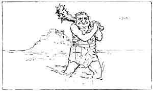 In those days the Mount of Cornwall was kept by a huge giant named Cormoran. He was eighteen feet in height and about three yards round the waist, of a fierce and grim countenance, the terror of all the neighbouring towns and villages. He lived in a cave in the midst of the Mount, and whenever he wanted food he would wade over to the mainland, where he would furnish himself with whatever came in his way. Everybody at his approach ran out of their houses, while he seized on their cattle, making nothing of carrying half a dozen oxen on his back at a time; and as for their sheep and hogs, he would tie them round his waist like a bunch of tallow-dips. He had done this for many years, so that all Cornwall was in despair.