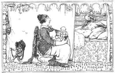 They rode, and they rode, till at last they stopped before a cottage door. So they got down and went in and found the good woman abed with the children playing about; and the babe, a fine bouncing boy, beside her.