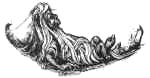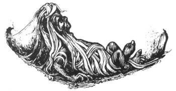 Naturally he wondered where the stone might be, and he looked again, and there by the hedge bottom was a great flat stone, nigh buried in the mools, and hid in the cotted grass and weeds. One of the stones was called the 'Strangers' Table'. However, down he fell on his knee-bones by that stone, and hearkened again. Clearer than ever, but tired and spent with greeting came the little sobbing voice -- 'Ooh! ooh! the stone, the stone on top.' He was gey, and misliking to meddle with the thing, but he couldn't stand the whimpering babby, and he tore like mad at the stone, till he felt it lifting from the mools, and all at once it came with a sough out o' the damp earth and the tangled grass and growing things. And there in the hole lay a tiddy thing on its back, blinking up at the moon and at him. 'Twas no bigger than a year-old baby, but it had long cotted hair and beard, twisted round and round its body so that you couldn't see its clothes; and the hair was all yaller and shining and silky, like a bairn's; but the face of it was old and as if 'twere hundreds of years since 'twas young and smooth. Just a heap of wrinkles, and two bright black eyne in the midst, set in a lot of shining yaller hair; and the skin was the colour of the fresh-turned earth in the spring -- brown as brown could be, and its bare hands and feet were brown like the face of it. The greeting had stopped, but the tears were standing on its cheek, and the tiddy thing looked mazed like in the moonshine and the night air.