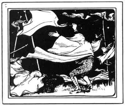 So after the laundry-maid had his money in her apron as they went merrily along, she stopt, exclaiming: 'My clothes are left outside, I must run back and bring them in.' 'Stop for me while I go; it is a cold frosty night,' said William, 'you'd be catching your death.' So the girl waited long enough to take her feathers out and say, 'By virtue of my three feathers may the clothes slash and blow about till morning, and may William not be able to take his hand from them nor yet to gather them up.' And then she was away to bed and to sleep.