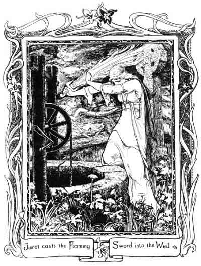 First they turned him in Janet's arms like frozen ice, then into a huge flame of roaring fire. Then, again, the fire vanished and an adder was skipping through her arms, but still she held on; and then they turned him into a snake that reared up as if to bite her, and yet she held on. Then suddenly a dove was struggling in her arms, and almost flew away. Then they turned him into a swan, but all was in vain, till at last he was turned into a red-hot glaive, and this she cast into a well of water and then he turned back into a mother-naked man. She quickly cast her green mantle over him, and young Tamlane was Burd Janet's for ever.