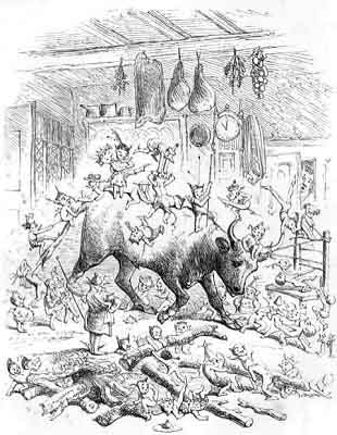 Friskey next clapped his tiny hands, and forthwith three obedient Pixies appeared, each mounted and sitting between the prongs of a pitchfork turned upwards, and so they glided onward towards the fire. The pitchforks stopped of themselves, and then the urchins dismounted; and one putting his fork into the nose of the poor ox, whilst the other did the same to his rump, and the third poked at his side, they had him up in a trice, and contrived to suspend him ready for roasting before the fire. And then they all set to and whirled and turned him backwards and forwards and round about like so many mad turnspits, and basted him with the cook's ladle and with all the butter and cream that they could steal from the dairy; for Pixies are very good cooks, and know that meat is never delicate or tender unless basted with care. The roasting was soon finished; for a fire kindled by such means is strong, swift, and subtle in its operations.