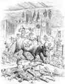 And then, exactly while the old farmer in his hiding hole could count seven, three times was the ox lifted up and three times again let down, before it was transferred to the large kitchen table. This done, one little wretch, far more ugly than all the rest, with something bright and sparkling about his brows (the form of which the farmer could not exactly make out), stamped with his tiny feet, and bade the whole band to the feast. In another moment, out flew a thousand little knives, each in shape resembling a cutlass, and each Pixy fell to "tooth and nail," on the good cheer, cutting and carving and helping himself. They all seemed highly to enjoy their supper, and chatted and talked as fast as they ate in a sort of squeak very like the squeak of mice in a corner. These little wretches contrived in a few minutes, to devour fat and lean, and every part of the ox except the brain, the eyes, and bones and sinews. The bones, however, were picked quite clean, and looked to the wondering farmer, to be as white as drifted snow. They were then cast under the table.