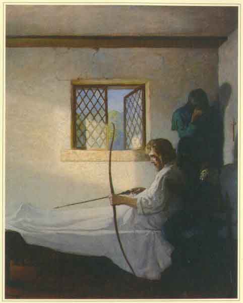 Leaning heavily against Little John's sobbing breast, Robin Hood flew his last arrow out through the window, far away into the trees