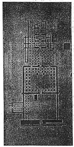 FIG. 13.—Plan of the Temple of Ramses II. in the Memnonia at Thebes Lepsius), showing the pylon at the open end, the various doors along the axis, the sanctuary at the closed end, and the temple at right angles.