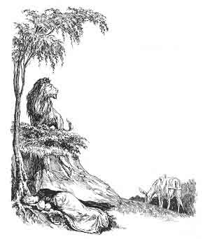 The lion would not leave her desolate, but went with her as a strong guard and as a faithful companion. When she slept he kept watch, and when she waked he