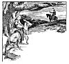 Long she travelled thus through lonely places, where she thought her wandering Knight might pass, yet never found trace of living man. At length she came to the foot of a steep mountain, where the trodden grass showed that there was a path for people to go. This path she followed till at last she saw, slowly walking in the front of her, a damsel carrying a jar of water