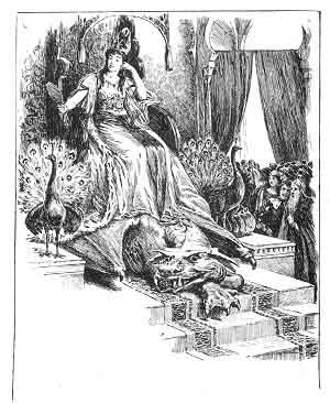 High above all there was a cloth of state, and a rich throne as bright as' the sun. On the throne, clad in royal robes, sat the Queen. Her garments were all glittering with gold and precious jewels; but so great was her beauty that it dimmed even the brightness of her throne. She sat there in princely state, shining like the sun. She hated and despised all lowly things of earth. Under her scornful feet lay a dreadful dragon, with a hideous tall. In her hand she held a mirror in which she often looked at her face; she took