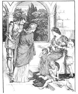 After this Una took him one day to visit the third daughter, whose name was Love. She was so wonderfully beautiful and good that there were few on earth to compare with her. They found her in the midst of a group of happy children; she wore a yellow robe, and sat in an ivory chair, and at her side were two turtle-doves.