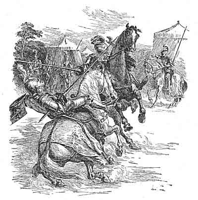 The next morning the tournament began anew. Satyrane, with his gallant band, was the first to appear, but Sir Triamond was unable to prepare for battle, because of his wound. This grieved him much, and Cambell, seeing this, and eager to win honour on his friend's behalf, took the shield and armour which were well known to belong to Triamond, and without saying a word to any one, put them on and went forth to fight.