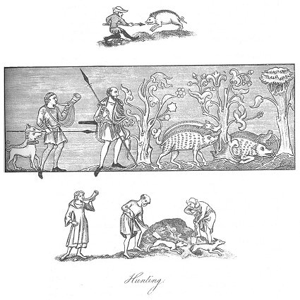 The representation in the centre of the first plate of a Saxon chieftain, attended by his huntsman and a couple of hounds, pursuing the wild swine in a forest, is taken from a painting of the ninth century in the Cotton Library. 3