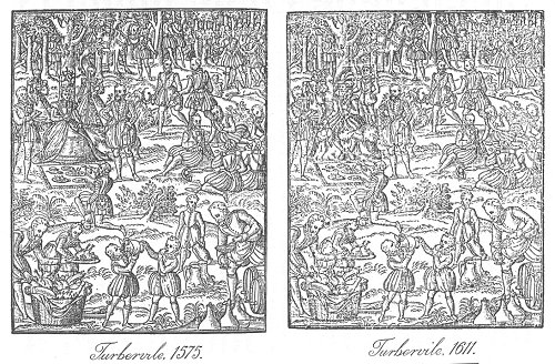 * In the first edition of Turbervile's "Noble Art of Venerie," issued in 1575, there is a woodcut representing Queen Elizabeth being entertained in the midst of a forest scene. In the second edition, issued in 1611, the same woodcut was used, but Elizabeth was ingeniously changed into James I., and the Queen's two maids of honour into pages in waiting. These two cuts are given side by side on plate three.
