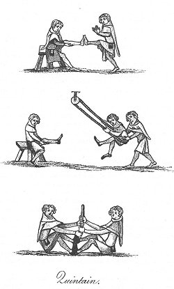 THE QUINTAIN.--Tilting or combating at the quintain is certainly a military exercise of high antiquity, and antecedent, I doubt not, to the jousts and tournaments. The quintain, originally, was nothing more than the trunk of a tree or post set up for the practice of the tyros in chivalry. 2 Afterward a staff or spear was fixed in the earth, and a shield being hung upon it, was the mark to strike at: the dexterity of the performer consisted in smiting the shield in such a manner as to break the ligatures and bear it to the ground. In process of time this diversion was improved, and instead of the staff and the shield, the resemblance of a human figure carved in wood was introduced. To render the