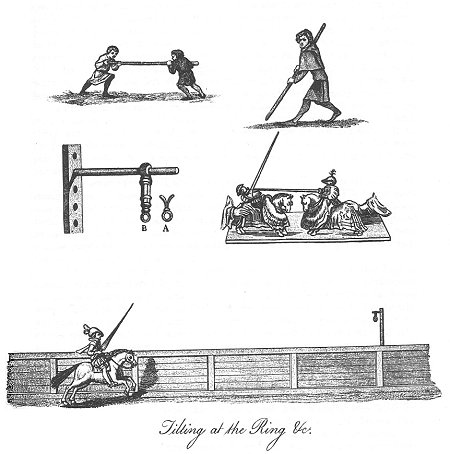 Tournament a general Name for several Exercises--The Quintain an ancient Military Exercise--Various Kinds of the Quintain--Derivation of the Term--The Water Quintain--Running at the Quintain practised by the Citizens of London; and why--The Manner in which it was performed--Exhibited for the Pastime of Queen Elizabeth--Tilting at a Water Butt--The Human Quintain--Exercises probably derived from it--Running at the Ring--Difference between the Tournaments and the Jousts--Origin of the Tournament--The Troy Game; the Bohordicum or Cane Game--Derivation of Tournament; How the Exercise was performed--Lists and Barriers--When the Tournament was first practised--When first in England--Its Laws and Ordinances--Pages, and Perquisites of the Kings at Arms, etc.--Preliminaries of the Tournament--Lists for Ordeal Combats--Respect paid to the Ladies--Jousts less honourable than Tournaments--The Round Table--Nature of the Jousts--Made in Honour of the Fair Sex--Great Splendour of these Pastimes; The Nobility partial to them--Toys for initiating their Children in them--Boat Jousts, or Tilting on the Water--Challenges to all corners.