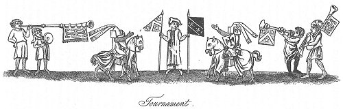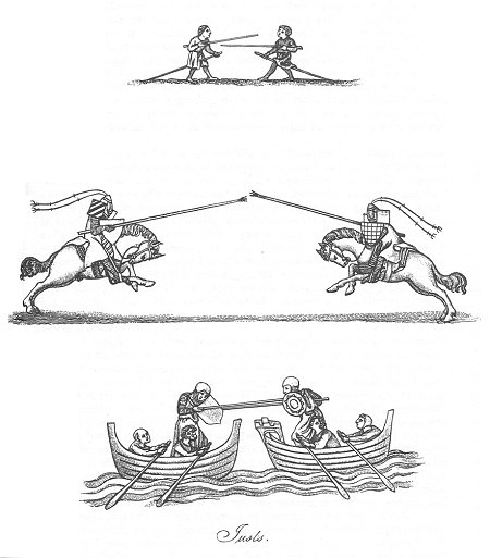 DIFFERENCE BETWEEN TOURNAMENTS AND JOUSTS.--Tournaments and jousts, though often confounded with each other, differed materially. The tournament was a conflict with many knights, divided into parties and engaged at the same time. The joust was a separate trial of skill, when only one man was opposed to another. The latter was frequently included in the former, but not without many exceptions; for the joust, according to the laws of chivalry, might be made exclusive of the tournament. 3